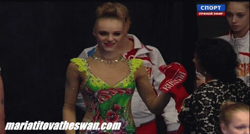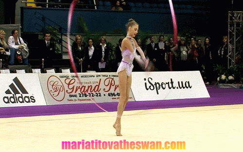 Another GIF, I love Masha’s ribbon ending pose in Happy Caravan Tashkent 2012, junior team competition, extract from Marc’s video I bought. I found Masha having good reaction of ending, she did well too in WC Kiev 2012.